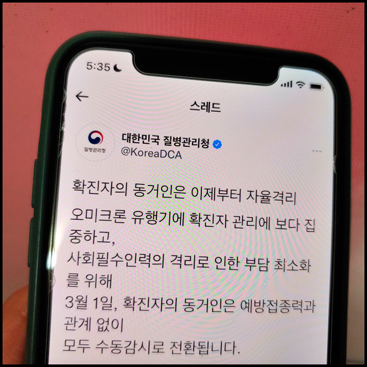 [사진 = 질병관리청 공식 트위터에서는 3월 1일부터 자가격리 기준 달라졌음을 알렸습니다. 확진자 동거인은 예방접종력과 관계 없이 모두 수동감시로 전환된다고 합니다. (C) 질병관리청 공식 트위터]