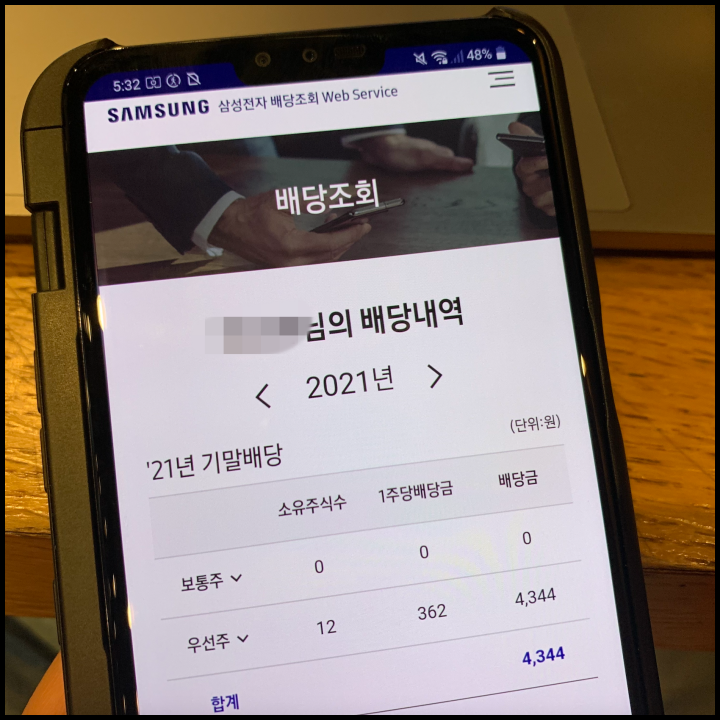 [사진 = 이렇게 저의 배당내역 확인할 수 있었습니다. 저는 2021년 12월까지 우선주만 12주 보유했습니다. 여기서 15.4%의 배당소득세 빼면 실제 배당금 나옵니다. (C) 삼성전자 배당조회 앱]