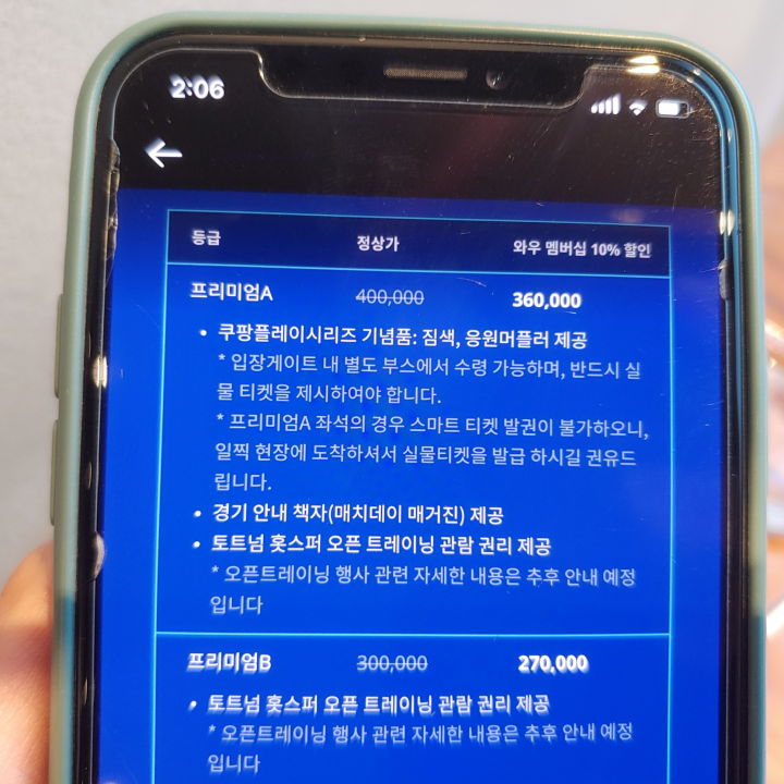 이번에 토트넘 중계 TV 방영되지 않으면서 쿠팡플레이 시청하려는 사람들이 상당히 많을 것으로 보인다. 만약 해당 OTT 서비스 가입할 경우 쿠팡 와우회원에 자동적으로 가입되기 때문에 향후 쿠팡에서 인터넷 쇼핑 시 여러 혜택을 누릴 수 있다. 특정 상품의 경우 와우회원 대상의 할인 혜택 기회도 얻을 수 있다. 글쓴이 같은 경우 며칠 전 쿠팡에서 선풍이 새롭게 구입했는데 와우회원 할인 혜택 받게 됐다. 얼마 전 와우회원 한 달 이용료가 4,990원으로 인상되었으나 가입할 경우 쿠팡플레이 혜택 포함한 여러 혜택을 누릴 수 있다는 점에서 여전히 쓸 수 밖에 없는 듯 하다.