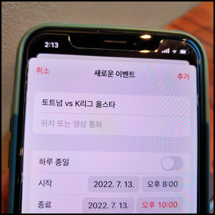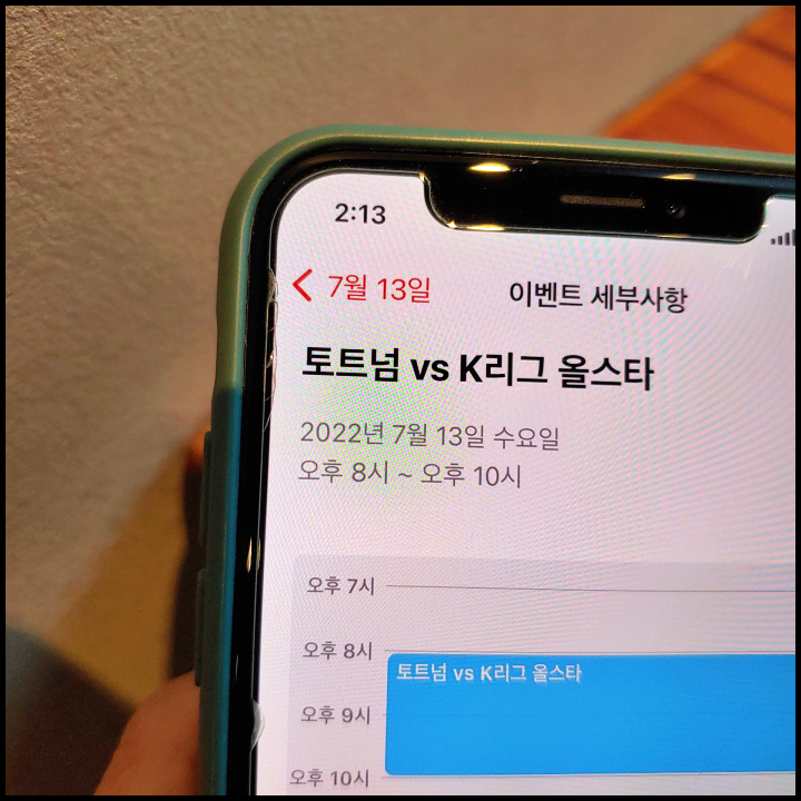 [사진 = 2022년 7월 13일 토트넘 K리그 올스타 맞대결이 펼쳐진다. 사진은 글쓴이 스마트폰 달력이며 해당 일을 가리킨다. 이날 저녁에 많은 비가 내릴 것으로 예상되기 때문에 이 경기는 수중전이 예상된다. 선수들이 다치지 않고 경기에 임했으면 하는 바람이며 서울 월드컵 경기장 찾는 관중들은 우의를 챙기고 경기를 관람해야 할 것으로 보인다. 관중석에 따라 비를 맞고 그라운드를 봐야 하는 곳도 있다. (C) 나이스블루]