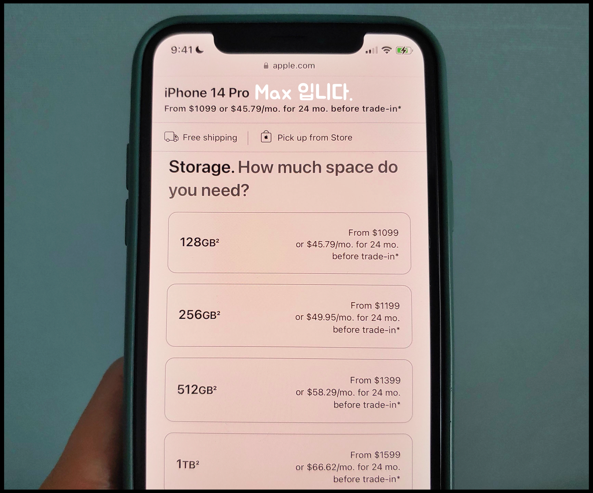 한국에서 아이폰14 프로맥스 175만 원부터 시작합니다. 프로 모델은 155만 원부터 시작합니다. 프로 맥스 128GB 175만 원, 256GB 190만 원, 512GB 220만 원, 1TB 250만 원으로 책정됐습니다.