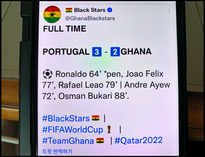 [사진 = 가나 축구 협회 공식 트위터에서 2022 카타르 월드컵 H조 1차전 포르투갈전 2-3 패배 소식을 전했다. 2차전은 한국 가나 맞대결 펼쳐진다. 서로 1차전에서 승리하지 못했다는 점에서 2차전은 공격적인 경기를 펼치려 할 것이다. (C) 가나 축구협회 공식 트위터]