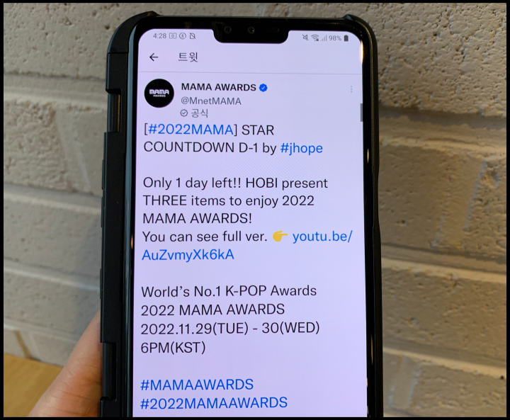 [사진 = MAMA 2022 이틀 동안 개최됩니다. 오후 4시부터 레드카펫, 오후 6시부터 본행사 시작합니다. 사진은 저의 스마트폰 달력이며 11월 29~30일에 펼쳐집니다. (C) 나이스블루]