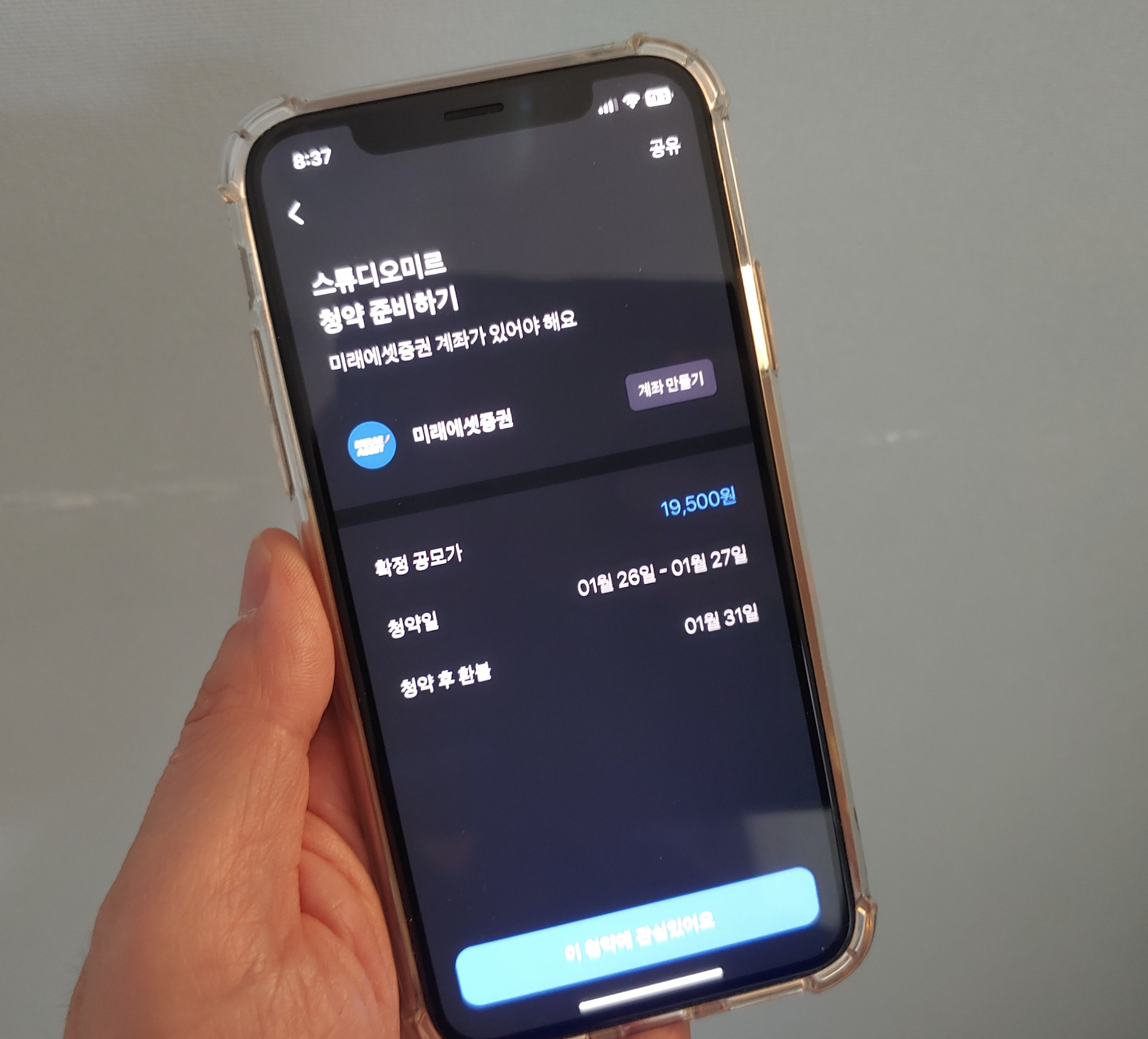[사진 = 스튜디오미르 공모주 청약 미래에셋증권 M-STOCK 앱을 통해서 신청할 수 있습니다. 환불일 및 납입일 2023년 1월 31일이며 상장 예정일은 2월 7일로 소개됐습니다. (C) 미래에셋증권 M-STOCK 앱]