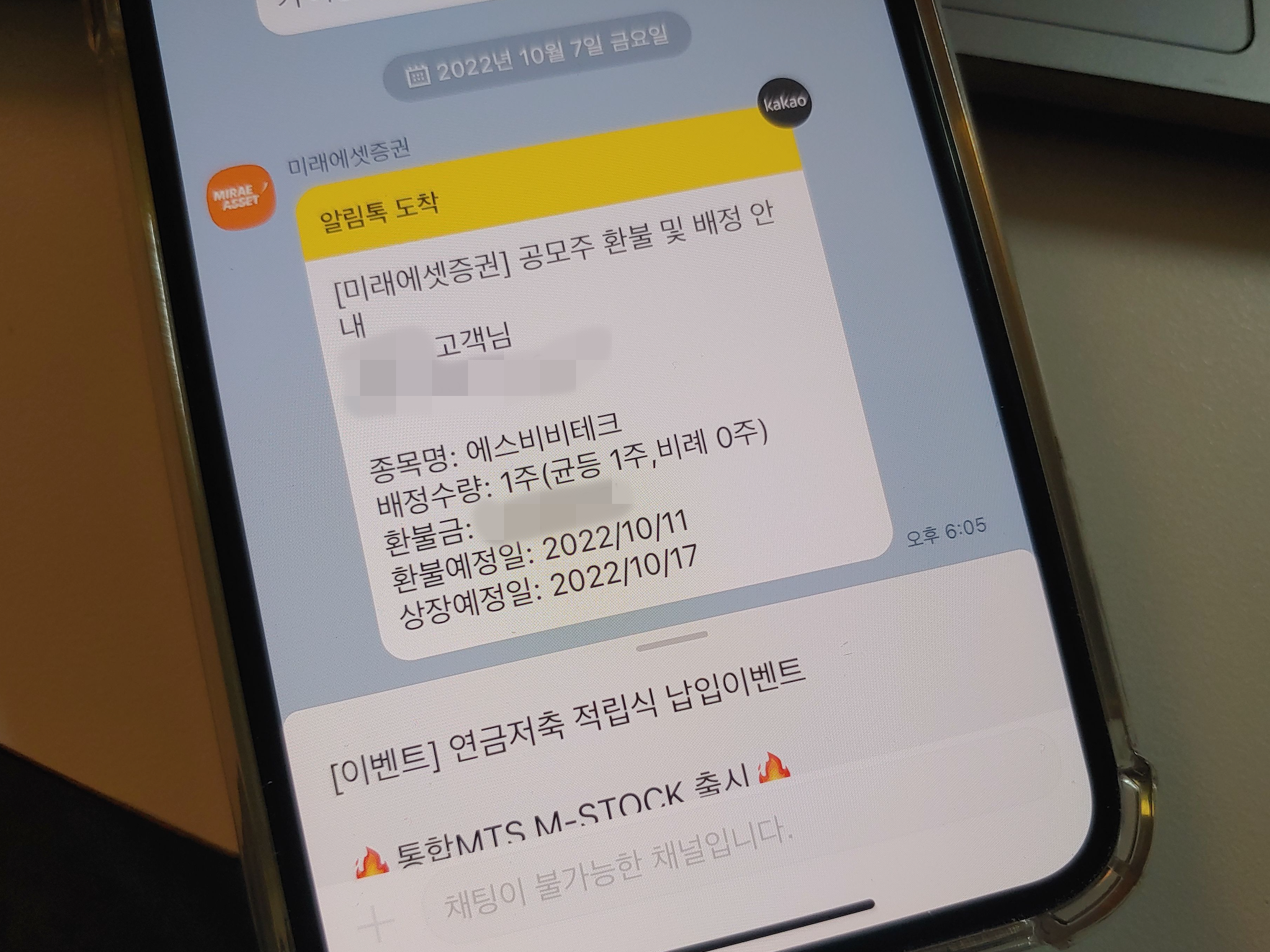 저 같은 경우 지난해 10월 7일 미래에셋증권으로부터 에스비비테크 공모주 균등 1주 배정을 카카오톡으로 접했습니다. 해당 공모주 균등배정 경쟁률이 1.09대 1이었던 것으로 기억하는데 일반 투자자들에게 기본 1주씩 배정됐으며 대략 100명 중에 9명이 2주 받았다고 보시면 됩니다. 상장 첫 날에 주가 흐름 좋았던 것으로 기억합니다. 스튜디오미르 공모주 청약 같은 경우 미래에셋증권 계좌 있어야만 합니다. 다만, 에스비비테크 청약때와는 분위기가 다를 가능성이 있습니다. 균등 물량이 얼마되지 않기 때문입니다. 이번에 일반 투자자 많이 몰리면 균등 1주도 못받는 분들이 나올지 모릅니다.