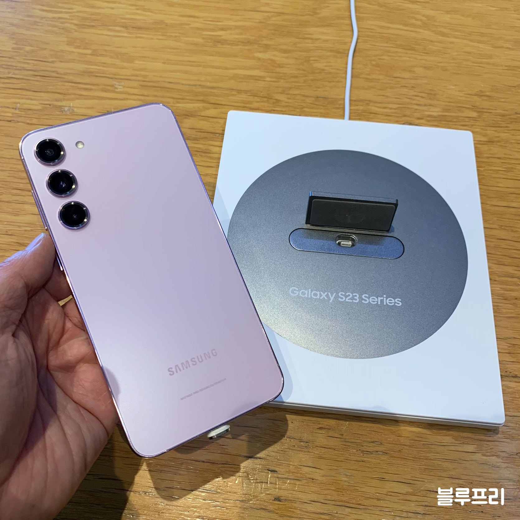이번에는 갤럭시S23 플러스 라벤더 후면 모습입니다. 해당 색상도 일반형 및 울트라 모델에 기본으로 적용됐습니다. 아까전에 봤던 그린과는 다르게 밝은 톤이 인상적인 모델입니다.