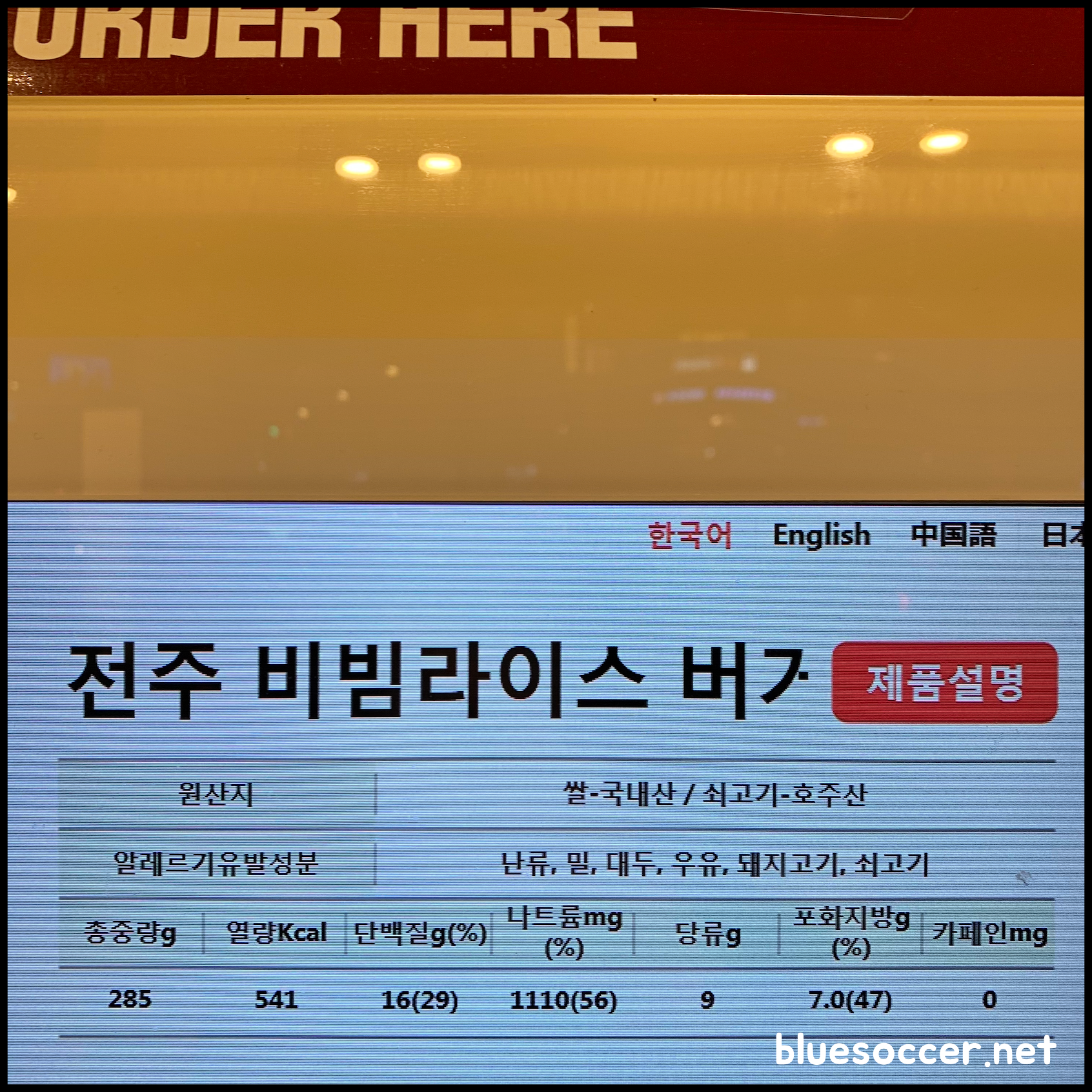 [사진 = 롯데리아 전주비빔 라이스버거 가격 이렇습니다. 매장 자판기에서는 6,900원(버거) 8,800원(세트)으로 표기됐습니다. 버거만 놓고 보면 웬만한 한 끼 식사 비용과 비슷합니다. 음료수를 자판기에서 주문할 경우 제로콜라 선택해서 먹을 수 있습니다. 또한 롯데리아 전주비빔 라이스버거 칼로리 등에 대하여 궁금하신 분들이 계실 듯합니다. 주요 영양성분을 보면 541kcal이며 나트륨 1,110mg(56%)라고 합니다. 원산지는 쌀이 국내산, 쇠고기 호주산으로 안내됐습니다. (C) 나이스블루]