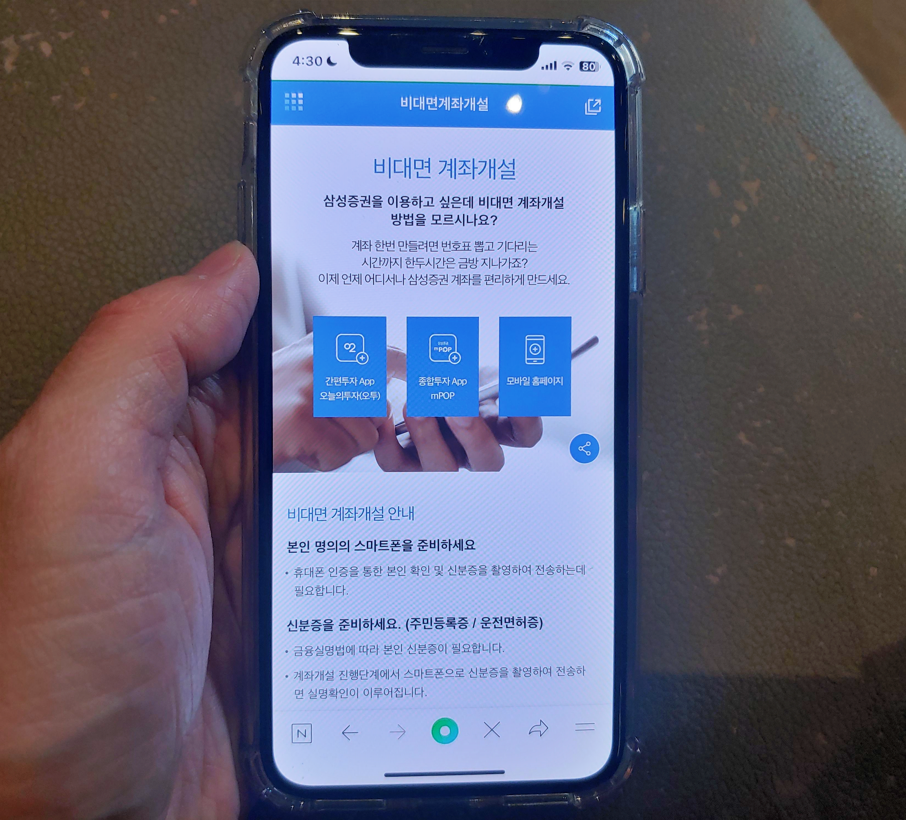 [사진 = 삼성증권 계좌개설 청약 당일에 비대면으로 할 수 있습니다. 비대면 계좌개설하려면 반드시 본인 명의의 스마트폰으로 신분증 있어야 합니다. 주민등록증 또는 운전면허증 말입니다. 스마트폰으로 신분증 촬영하는 과정이 있다고 합니다. 다른 금융사 계좌번호도 있어야 하는 이유는 본인 확인 추가 절차 때문입니다. 최근 증권사 계좌개설할 때 다른 금융사 계좌번호가 필요한 경우가 있습니다. (C) 삼성증권 공식 홈페이지]