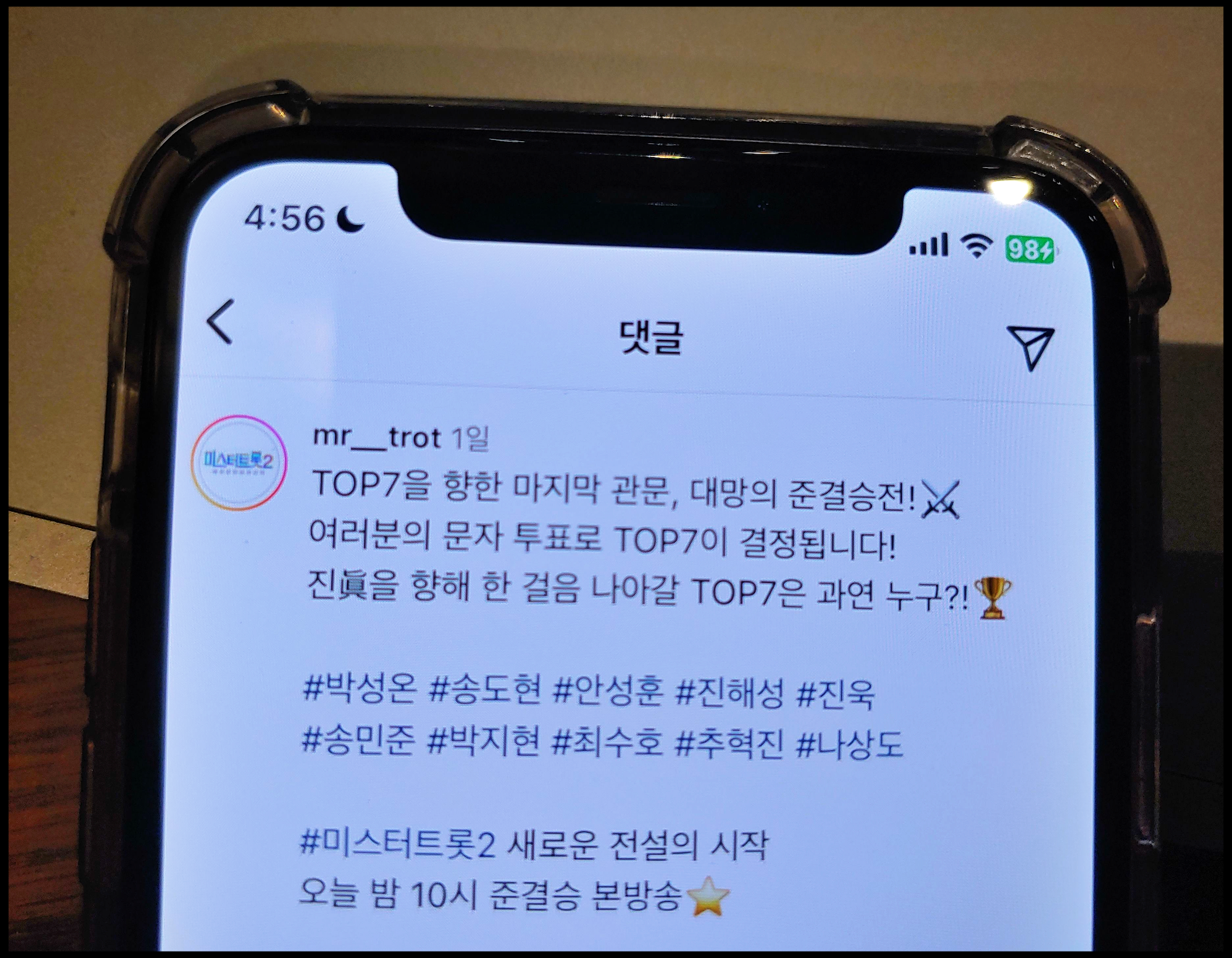 [사진 = 미스터트롯2 공식 인스타그램에서는 지난 3월 9일 방영분 예고하는 게시물을 올렸습니다. 이번에 방영된 준결승전을 통해 TOP7 결정됐습니다. 7명 중에서 1명은 오는 3월 16일 결승전 방영분을 통해 진의 영광을 누립니다. (C) TV조선 미스터트롯2 공식 인스타그램]