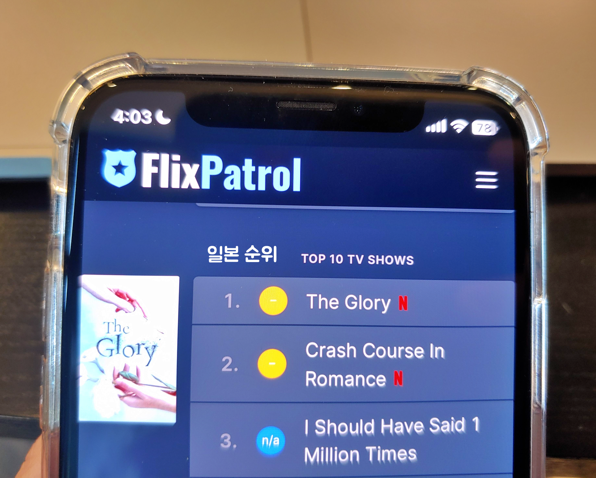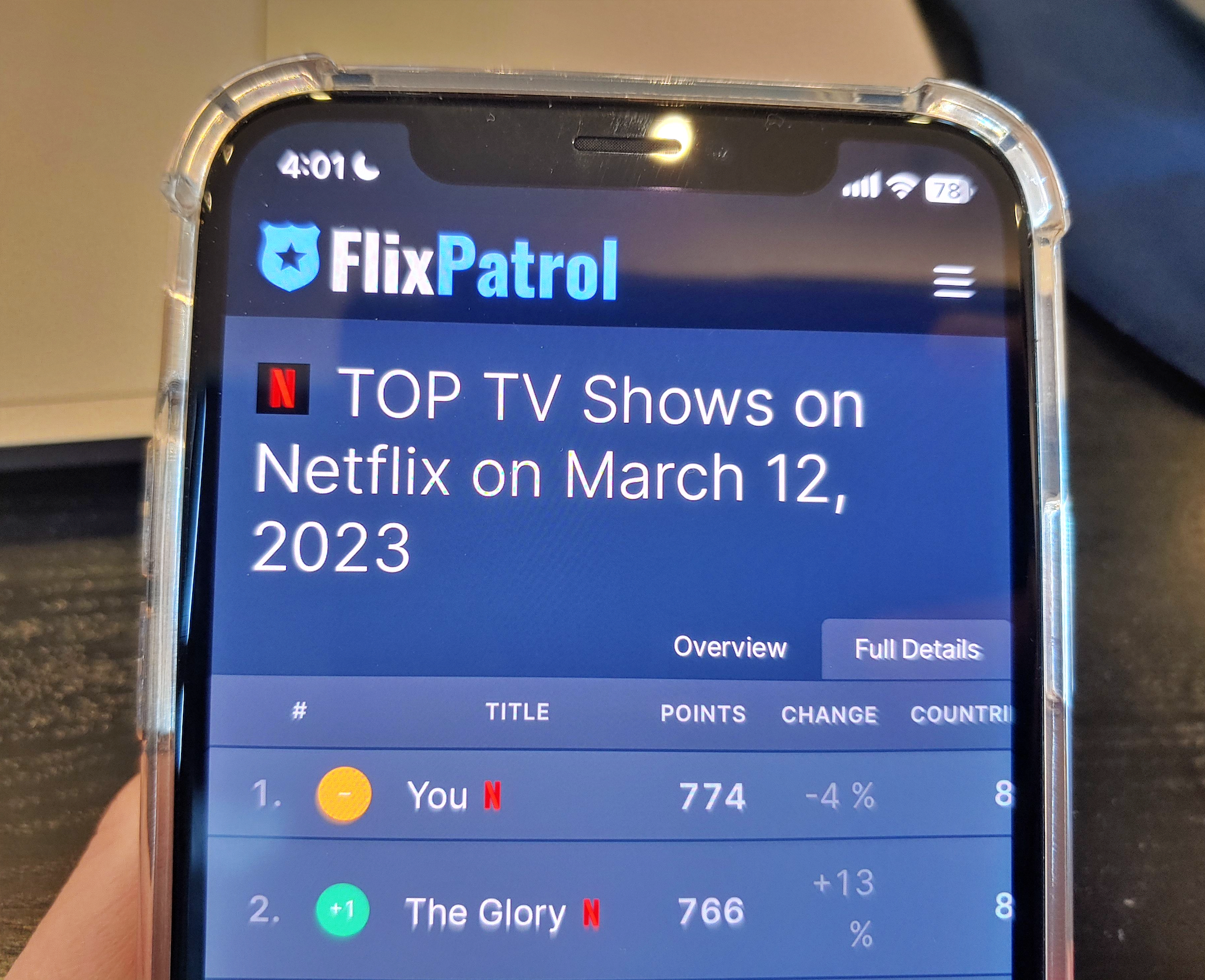 [사진 = 박지아 출연했던 더글로리 넷플릭스 세계 순위 플릭스페트롤(FlixPatrol)에서 3월 12일 기준 전 세계 TV 시리즈 부문 766점 얻으며 2위 기록했습니다. 1위 You(774점)와는 불과 8점 차이입니다. 또한 더글로리 넷플릭스 일본 순위 1위 진입했습니다. 참고로 2위 Crash Course In Romance는 알고보니 한국의 tvN 드라마 일타스캔들 입니다. 일본에서 많이 봤던 넷플릭스 TV 프로그램 1~2위가 한국 드라마입니다. (C) FlixPatrol Homepage]