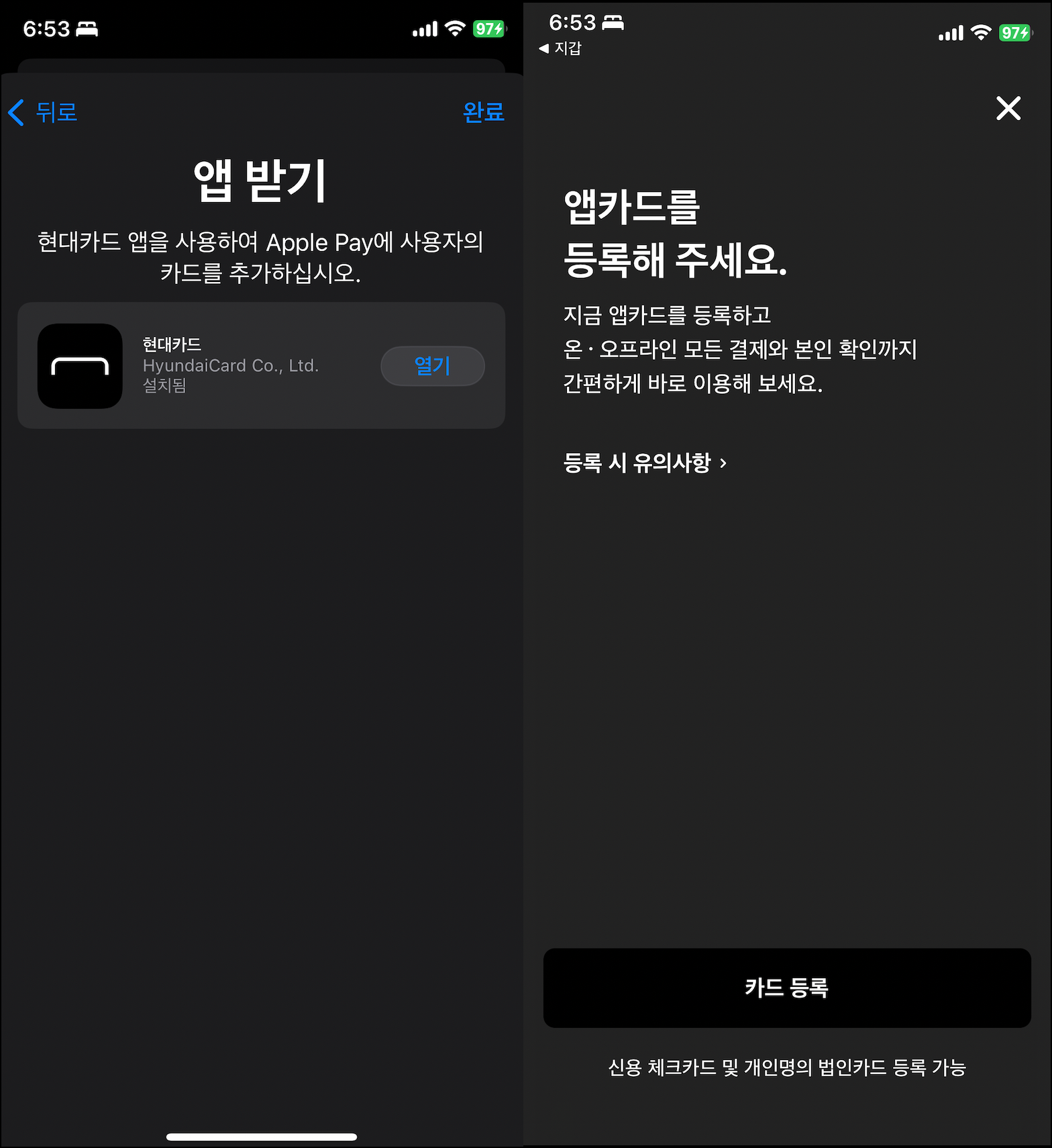 그 이후 저의 아이폰 화면에서는 앱 받기에 현대카드가 뜹니다. 알고봤더니 아이폰에 현대카드 앱이 반드시 설치되어야 합니다. 이 과정에서 카드 등록 메뉴 선택하면 됩니다.