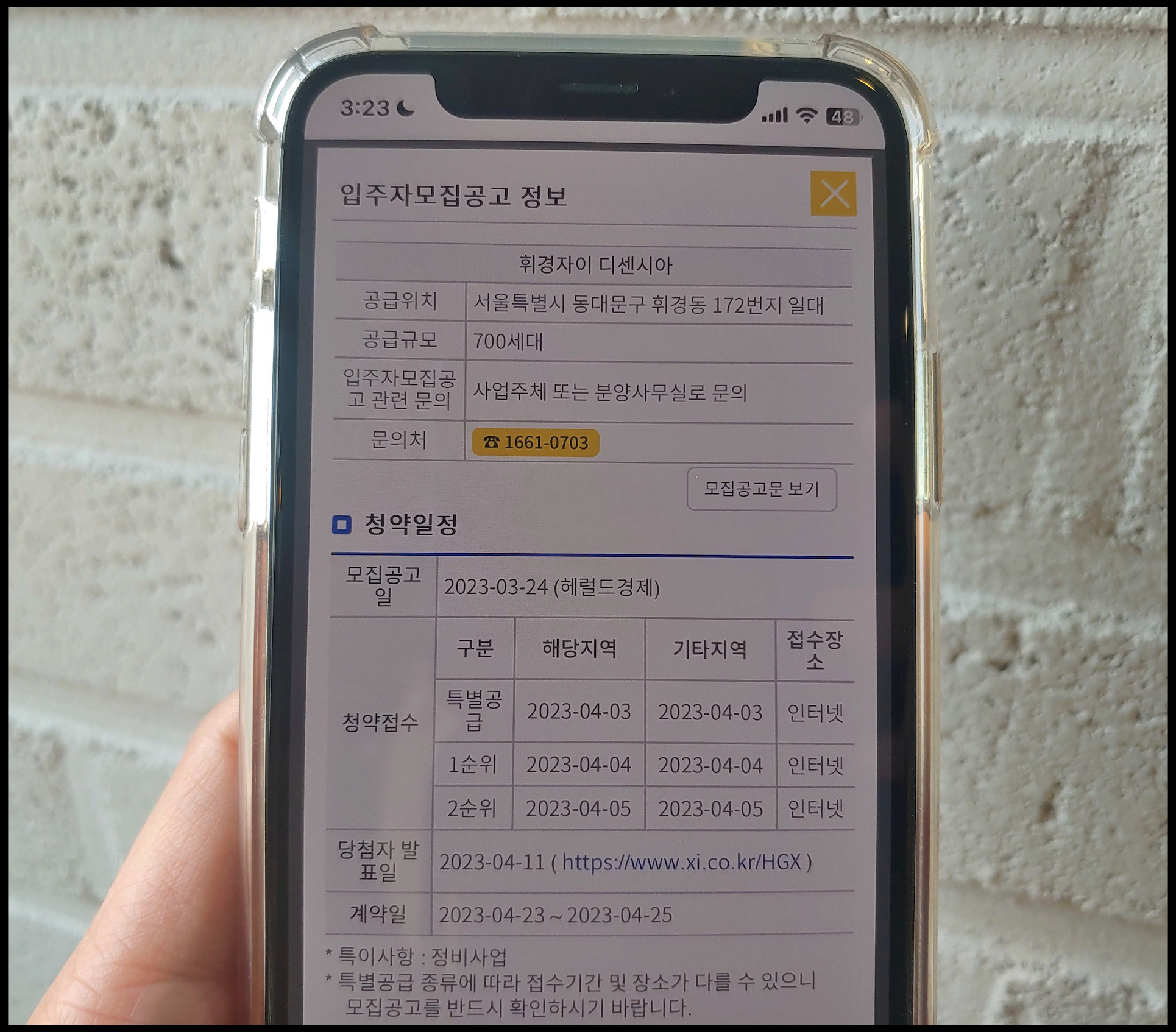 [사진 = 청약Home에 올라온 입주자 모집공고를 보면 휘경자이 디센시아 청약 일정 나왔습니다. 4월 3일 특별공급, 4월 4일 1순위, 4월 5일 2순위이며 당첨자는 오는 4월 11일 해당 아파트 단지 공식 홈페이지에서 발표된다고 합니다. 휘경자이 디센시아 계약일 2023년 4월 23일부터 25일까지 3일 동안이라고 안내됐습니다. (C) 청약Home 앱]