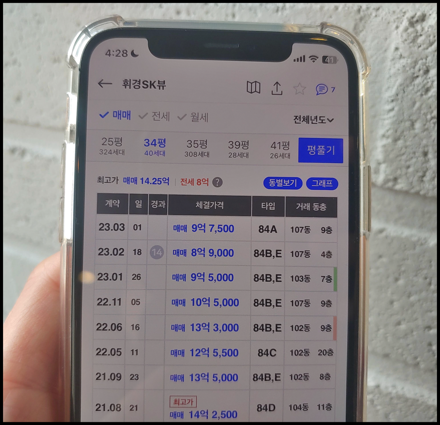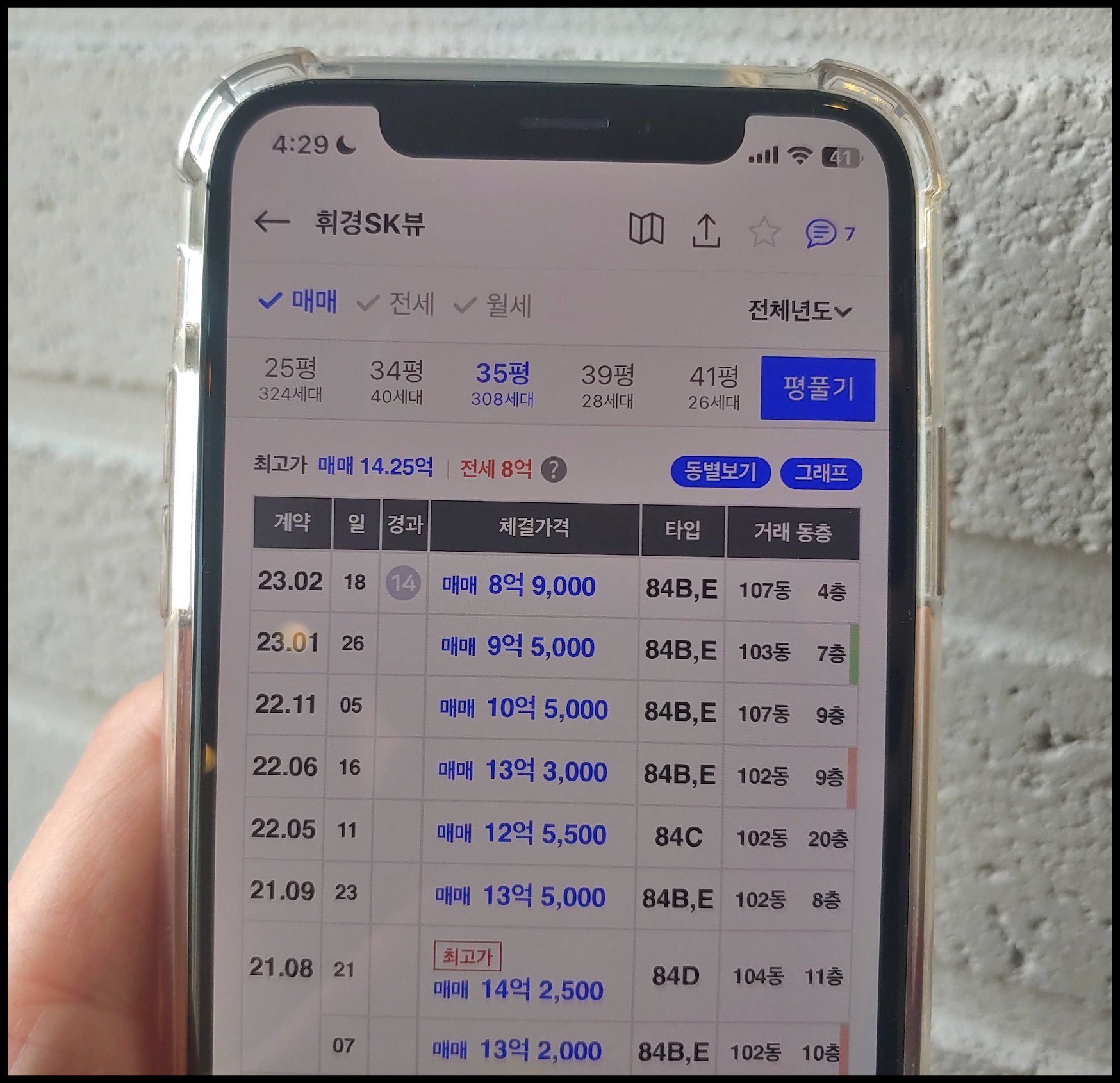 39 : 1층(1세대) 355,000,000원 / 2층(1세대) 376,000,000원 / 3~5층(5세대) 397,000,000원 / 6~9층(4세대) 405,000,000원 / 10~19층(7세대) 409,000,000원 / 20~29층(1세대) 413,000,000원