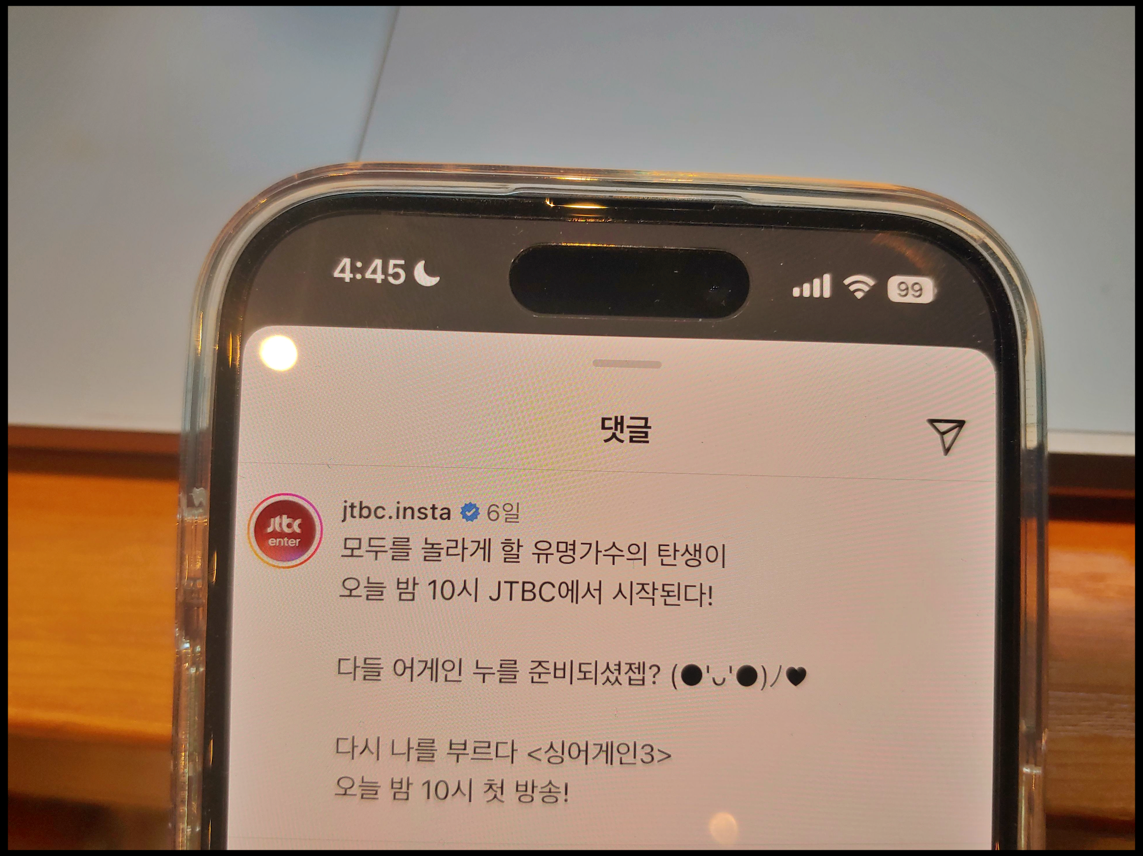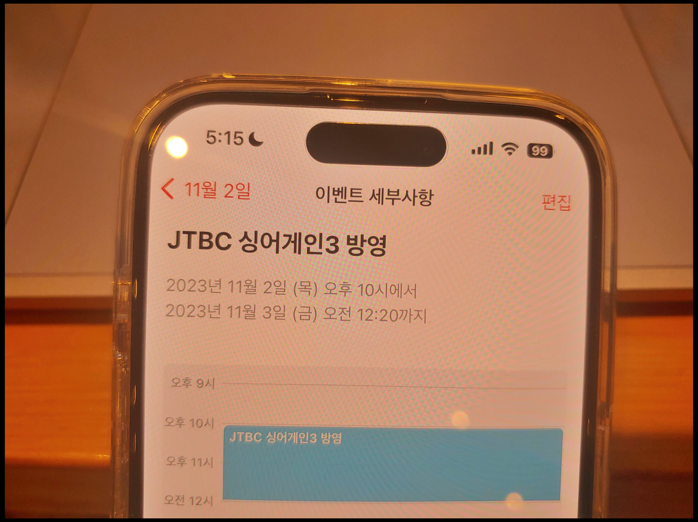 [사진 = 2023년 11월 2일 JTBC 싱어게인3 2회 방영 예정입니다. 사진은 저의 스마트폰 달력이며 해당 일을 가리킵니다. (C) 나이스블루]