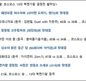 거미 썸네일형 리스트형 히든싱어4 거미, 출연 타이밍 환상적인 이유 히든싱어4 거미 출연은 아마도 저 같은 복면가왕 애청자에게 희소식이 되지 않을까 싶습니다. 지난 가을 MBC 일밤 복면가왕에서 소녀의 순정 코스모스(이하 코스모스) 닉네임으로 4연승을 달성하며 뛰어난 가창력을 과시했던 거미 히든시어4 등장합니다. 오는 12월 12일 오후 11시 JTBC에서 히든싱어4 거미 노래부르는 모습을 볼 수 있습니다. 그녀가 지금까지 가수 활동하면서 어떤 명곡을 불렀는지 떠올리는 것과 더불어 거미 모창 어느 분이 기가막히게 잘 표현할지 기대됩니다. [사진 = 거미 출연을 알리는 히든싱어4 공식 페이스북 메인 (C) facebook.com/jtbchiddensinger] 현시점에서 히든싱어4는 대중들에게 낯설지 않습니다. 지난 10월 3일 보아편부터 시작으로 김진호(SG워너비) 민경.. 더보기 복면가왕 코스모스, 거미 조정석 아름다운 사랑 복면가왕 코스모스 거미 정체가 드디어 드러났습니다. 그녀가 노래를 잘 불렀음에도 판정단 101인 선택의 마음은 제각각 달랐습니다. 거미 보다는 복면가왕 캣츠걸 (차지연 추정) 출연자에게 더 많은 표가 누적됐습니다. 끝내 복면가왕 코스모스 거미 모습이 공개되었는데 그녀의 남자친구 언급이 더욱 주목을 끌었습니다. 거미 조정석 서로 많이 좋아하는 관계라는 것을 확인할 수 있었습니다. 그녀가 조정석 언급하며 눈물 보였던 모습을 보면 거미 조정석 서로 애뜻한 관계임을 알게 됐습니다. [사진 = 거미는 자신의 페이스북을 통해 복면가왕 코스모스 인증샷 올렸습니다. (C) 거미 공식 페이스북(facebook.com/cjesgummy)] 2015년 가을 복면가왕을 화려하게 빛냈던 복면가왕 코스모스 거미 한동안(?) 무대.. 더보기 복면가왕 코스모스, 거미 몽중인 명곡의 탄생 복면가왕 코스모스 거미 5연승 가능할지 기대됩니다. 아직 그녀의 정체 드러나지 않았으나 많은 사람들은 복면가왕 코스모스 거미 예상하는 중입니다. 지난 16대 복면가왕 결정전에서는 거미 몽중인 노래가 많은 사람들을 감동시켰습니다. 그동안 복면가왕에 출연하면서 시청자들에게 여러 명곡을 선사했던 복면가왕 코스모스 저력이 17대 복면가왕 결정전에서도 통할지 기대됩니다. 거미 몽중인 노래에 이은 또 다른 저력을 기대합니다. *이 글은 복면가왕 코스모스 거미 맞다는 전제하에 작성합니다. [사진 = MBC 일밤 복면가왕 로고 (C) 복면가왕 공식 페이스북 프로필 사진(facebook.com/mbcmasksingers)] 시청자들이 복면가왕을 보는 이유에 대해서는 저마다 취향이 다르겠으나 기본적으로 '노래 잘하는 가수.. 더보기 복면가왕 코스모스 거미 장기집권 계속될까? 복면가왕 코스모스 거미 예상하는 사람들이 많습니다. 그녀의 연승 행진이 계속되고 있어서 아직 정체가 공개되지 않았으나 거미외에 다른 예상 후보는 거론되지 않는 것이 현실입니다. 이제는 그녀의 정체보다는 거미 장기집권 언제까지 지속되느냐가 더욱 큰 관심사가 됐습니다. 복면가왕 코스모스 거미 많은 표를 얻는 것을 보면 그녀가 노래 부르는 모습을 계속 보고 싶어하는 사람이 많다는 것을 알 수 있습니다. *이 글은 복면가왕 코스모스 거미 맞다는 전제하에 작성합니다. [제가 2011년 찍었던 코스모스 꽃 모습 (C) 나이스블루] 11월 1일 오후 4시 50분 MBC에서 방영되는 16대 복면가왕 결정전 1라운드가 진행되기 이전까지의 여론 분위기를 놓고 보면 복면가왕 코스모스 거미 가창력 향한 사람들의 찬사가 끊이지.. 더보기 복면가왕 코스모스, 거미 감동 재현되나? 복면가왕 코스모스 거미 예상되는 이유는 '거미 아니면 다른 가수는 아닐 것이다'라는 생각 때문입니다. 작곡가 김형석이 13대 복면가왕 결정전 2라운드에서 복면가왕 코스모스 향해 "코스모스님은 우리나라 디바 TOP3 안에 들어가는 분이에요"라고 언급한 것을 보면 복면가왕 코스모스 거미 맞다는 생각이 들게 됩니다. 김형석이 거미라고 말했는지 여부는 방송분에서 드러나지 않았으나 시청자들은 그녀를 거미라고 바라보고 있습니다. *이 글은 복면가왕 코스모스 거미 맞다는 전제하에 작성합니다. [사진 = 복면가왕 (C) 복면가왕 네이버 tv캐스트 메인(tvcast.naver.com/mask)] 이제는 누구나 복면가왕 코스모스 거미 예상하기 때문에 그녀의 정체가 과연 누구냐에 대해서는 큰 의미가 없을 수도 있습니다. 그.. 더보기 복면가왕 코스모스, 거미 양화대교 감동적 이 글은 복면가왕 코스모스 거미 맞다는 전제하에 작성합니다. 1~3라운드부터 13대 복면가왕 우승자 선정되기까지 항상 거미 목소리와 비슷했습니다. 특히 복면가왕 코스모스 거미 양화대교 노래는 저의 추측이지만 음원시장에서 나름 선전하지 않을까 싶은 생각이 듭니다. 그동안 음원시장에서 김연우, 이정 이후로 복면가왕에서 전파된 노래가 전반적으로 부진했음을 떠올리면 복면가왕 코스모스 양화대교 노래 많은 분들이 음원에서 듣게 될 것 같은 예상을 합니다. 9월 27일이 추석 당일인 것이 변수이긴 하지만요. [정리 = 복면가왕 소녀의 순정 코스모스 13대 복면가왕 결정전 활약상] 13대 복면가왕 3라운드에서는 복면가왕 코스모스 양화대교 (원곡 : 자이언티. Zion.T) 불렀을 때 TV 화면에서 눈