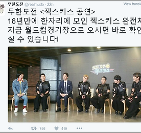 무한도전 토토가2 썸네일형 리스트형 무한도전 젝스키스 토토가2 감동적인 이유 무한도전 젝스키스 토토가2 출연 성사됐습니다. 지난 4월 14일 오후 8시 서울 월드컵 경기장에서 1990년대를 뜨겁게 열광시켰던 남자 6인조 아이돌 그룹 젝스키스 게릴라 콘서트가 진행됐습니다. 무한도전 젝스키스 공연 4월 16일 토요일에 토토가2 코너로 방송될 예정입니다. 이미 그들의 공연을 통해서 무한도전 토토가2 방영되는 것을 보면 아마도 무한도전 HOT 공연을 볼 수 있지 않을까 싶은 기대감이 없지 않습니다. 젝스키스와 HOT는 대표적인 라이벌 관계였죠. [사진 = 무한도전은 공식 트위터를 통해 젝스키스 공연을 예고했습니다. 해당 게시물을 통해서 젝스키스 고지용 합류했음을 알렸습니다. (C) 무한도전 공식 트위터(twitter.com/realmudo)] 무한도전 젝스키스 토토가2 공연은 제가 이 .. 더보기 이전 1 다음