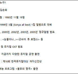 소냐 썸네일형 리스트형 복면가왕 연필, 소냐 아닐 가능성은? 복면가왕 연필 정체는 제가 글을 작성하는 시점을 놓고 보면 여러 인물이 후보로 꼽히는 중입니다. 그녀가 가왕이 되었던 12대 복면가왕 결정전에서 1라운드에서 하얀 겨울 불렀을 때를 놓고 보면 자두 음색입니다. 그런데 2라운드와 3라운드에서 개인곡 부르더니 소냐 음색을 냈습니다. 그래서 복면가왕 연필 소냐 예상을 하기 쉬웠습니다. 소냐 노래 잘 부른다는 점에서 복면가왕 경쟁력이 충분히 높습니다. 가수 및 뮤지컬 배우로서 오랫동안 부지런한 활약을 펼쳐왔었죠. [사진 = 소냐가 자신의 트위터에 남겼던 메시지. 무엇을 의미하는 것일까요? (C) 소냐 트위터(twitter.com/sonya3543)] 소냐는 9월 14일 월요일 자신의 트위터에 '재밌네', '헐'이라는 메시지를 남겼습니다. 9월 14일 월요일은 복.. 더보기 복면가왕 연필, 소냐 음색 느껴지는 인물 복면가왕 연필 정체 소냐 예상합니다. 그녀는 12대 복면가왕 등극했습니다. 1라운드까지만을 놓고 보면 복면가왕 연필 출연자가 자두 예상되었는데 2~3라운드 노래 들어보니까 아니었습니다. '자두가 저렇게 고음이 파괴적인 가수였나?'라는 생각이 들더군요. 복면가왕 연필 음색 들어보면 아마도 소냐 아닐까 싶습니다. 복면가왕 연필 진달래꽃 (원곡 : 마야) 들어봤더니 자두가 아닌 소냐 떠오르게 되더군요. 물론 복면가왕 소냐 출연하지 않았을 가능성도 있습니다만 적어도 복면가왕 연필이라는 출연자는 소냐 음색이 느껴지는 인물입니다. [소냐 프로필 간단 정리] 소냐는 뮤지컬 배우 겸 가수입니다. 뮤지컬 공연에 활발히 출연중인 것을 놓고 보면 홍지민 (복면가왕 하와이) 떠올리는 사람 있지 않을까 싶은데 그렇지 않습니다... 더보기 이전 1 다음