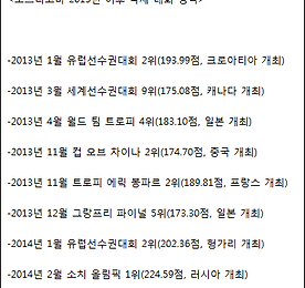 피겨스케이팅 썸네일형 리스트형 차준환 키, 피겨스케이팅 남자 프리스케이팅 진출 쾌거 차준환 키 그리고 그의 2018 평창동계올림픽 피겨스케이팅 남자 프리스케이팅 출전이 많은 사람들의 관심을 사로잡을 것으로 보입니다. 이른바 '김연아 키즈'에 속하는 차준환 피겨스케이팅 남자 선수로서의 존재감을 뚜렷하게 과시했습니다. 2월 16일 2018 평창동계올림픽 피겨스케이팅 남자 싱글 쇼트프로그램에서 83.43점으로 15위를 기록하며 프리스케이팅에 진출했습니다. 한국인 선수가 올림픽 무대에서 피겨스케이팅 남자 프리스케이팅 진출한 것은 이번이 처음입니다. [사진 = 차준환 (C) 2018 평창동계올림픽 공식 홈페이지 프로필 사진(pyeongchang2018.com)] 지금까지는 대중들에게 한국인 피겨스케이팅 선수하면 김연아와 곽민정 같은 은퇴 선수들을 떠올리기 쉬웠습니다. 김연아와 곽민정은 여자 피겨.. 더보기 소트니코바 세계선수권 불참 향한 따가운 시선 아델리나 소트니코바는 다음주 26일부터 30일까지 일본에서 펼쳐지는 2014 세계피겨스케이팅 선수권대회(이하 세계선수권)에 출전했어야 할 선수였습니다. 러시아 이외의 지역에서 올림픽 금메달리스트에 걸맞는 연기력을 선보일 필요가 있었기 때문이죠. 만약 그랬다면 세계의 많은 사람들에게 아마도 '김연아를 이길만 했다'는 반응을 얻었을지 모를 일입니다. 하지만 그럴 일이 없게 되었네요. 대회에 불참하기 때문이죠. 소트니코바의 세계선수권 불참은 소치 올림픽 판정 논란을 잠재우지 못한 꼴이 됐습니다. 심사 위원들의 판정이 정확했다면 올림픽 금메달은 소트니코바가 아닌 김연아에게 돌아갔겠죠. 그러나 소트니코바는 홈 어드벤티지 이점을 얻으면서 실제 연기력에 비해 과분한 점수를 받았고 그 결과 김연아를 제쳤습니다. 판정 .. 더보기 김연아 올포디움, 100년 역사상 최고의 선수 얼마전에 막을 내렸던 소치 올림픽 피겨스케이팅 여자 개인전 금메달은 러시아의 아델리나 소트니코바에게 돌아갔습니다. 그러나 많은 사람들은 소트니코바가 아닌 한국의 김연아를 세계 최고의 피겨스케이팅 여자 선수라고 생각할 것입니다. 소트니코바 금메달이 러시아 홈 어드벤티지 영향을 받았던 이유와 더불어 그동안 김연아가 세계 무대에서 환상의 연기를 과시했던 아우라가 여전히 많은 사람들에게 생생하게 기억되었기 때문입니다. 김연아의 올림픽 2연패가 무산된 것은 아쉬운 일입니다. 지금까지 올림픽 2회 연속 우승에 성공했던 선수가 단 2명(소냐 헤니 3연패, 카타리나 비트 2연패)인데 어쩌면 김연아도 이들과 같은 반열에 오를 수도 있었습니다. 그러나 김연아는 소치 올림픽 은메달을 통해 피겨스케이팅 여자 선수 중에서 지금.. 더보기 카타리나 비트, 김연아 지지 반가운 이유 김연아 올림픽 은메달에 공감하지 않는 사람이 많다는 것은 여러분들도 잘 알고 있을 것입니다. 2월 23일 오후 3시 현재까지 인터넷 청원 사이트 체인지에서는 일명 '김연아 서명운동' 참여 인원이 198만 5천 명을 넘었습니다. 앞으로 1만 5천 명이 더 참여하면 200만 명을 넘습니다. 해외 언론이나 세계적인 피겨스케이팅 레전드들도 김연아의 소치 올림픽 결과에 수긍하기 힘든 반응을 나타냈습니다. 국내 여론의 분위기와 일치한 것 같습니다. 그중에서 독일의 피겨스케이팅 전설 카타리나 비트의 김연아 지지가 눈길을 끌었습니다. 22일 캐나다 방송 CBC를 통해 "나는 김연아가 리피트 클럽 가입을 환영할 준비가 되어있다"고 밝혔습니다. 여기서 말하는 리피트 클럽은 올림픽 2연패 클럽입니다. 비트는 1984년과 1.. 더보기 아델리나 소트니코바, 김연아 NEW 경쟁자 2014 소치 올림픽 피겨스케이팅 여자 개인전 쇼트프로그램이 끝났습니다. 많은 사람들의 예상대로 1위는 한국의 김연아였습니다. 기술 점수 39.03점, 예술 점수 35.89점 따내며 총 74.92점으로 선두에 올랐습니다. 쇼트프로그램 이전까지는 2위로 예상되었던 선수의 국적이 러시아였습니다. 실제로 러시아 선수가 김연아보다 순위가 한 단계 더 낮습니다. 그런데 그 인물은 여론이 예상했던 그 러시아 선수가 아니었습니다. 쇼트프로그램 2위는 올해 18세의 러시아 출신 아델리나 소트니코바 입니다. 기술 점수 39.09점, 예술 점수 35.55점 얻으며 총 74.92점으로 김연아를 0.28점 차이로 추격했습니다. 기술 점수는 김연아보다 0.06점 많으며 7가지 수행 요소 총합 가산점에서도 김연아보다 1.06점 .. 더보기 김연아 쇼트 점수 1위, 악조건 극복해서 대단 밤을 샜던 보람을 느꼈습니다. 김연아 쇼트프로그램 경기가 우리나라 시간으로 오전 2시 20여분에 펼쳐졌는데 한국인 입장에서는 난감한 시간대였습니다. 그녀의 연기를 보고 싶어도 그 시간까지 버티기가 쉽지 않았습니다. 새벽에 일찍 일어나도 2시 기상은 무리였죠. 저의 선택은 전자였습니다. 이제 앞으로 김연아 경기를 볼 날이 별로 없으니까요. 쇼트프로그램의 경우 이번이 마지막 경기였습니다. 김연아가 2014 소치 올림픽 피겨스케이팅 여자 개인전 쇼트프로그램에서 1위를 달성했습니다. 기술점수 39.03점, 예술점수 35.89점을 포함하여 총 74.92점으로 1위에 올랐습니다. 그 점수는 지